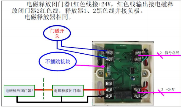 电磁释放闭门器1红色线接+24V,红色线输出接电磁释放闭门器2红色线,释放器1/2黑色线并接负极。
