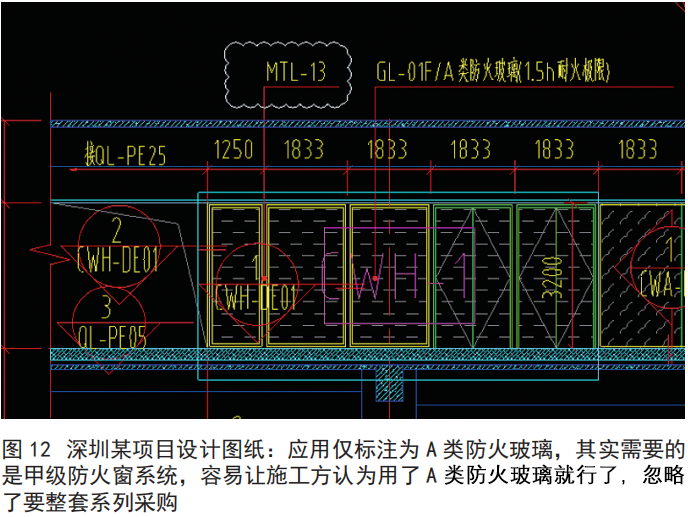 下面这个设计例子应用产品是某地铁的防火观察窗,要求材料组成是单片超白防火玻璃,厚度≥ 15mm,耐火极限不低于1.5h,有消防认证标示,防火窗构造一并满足耐火极限要求。材料技术要求是防火玻璃种类为 A 类隔热防火玻璃,耐火隔热性时间≥ 90min 且耐火完整性时间≥ 90min。分析:单片防火玻璃种类为 C 类防火玻璃,只满足耐火完整性,是满足不了耐火隔热性。设计前后描述互相矛盾,对《建筑设计防火规范》不熟悉。而这种错误的设计误导了施工和验收连环出错:由于设计上的错误标注,很容易误理解成防火(耐火)C1.5h 玻璃窗就是甲级防火玻璃窗。往往只是使用单片非隔热型防火或非隔热型镶玻璃构件就可以通过消防验收,这些都是不符合消防验收政策法规的。一旦发生火灾,施工、监理、设计师和甲方都有着不可推卸的责任。《中华人民共和国建筑法》第七十三条:关于”建筑设计单位不按照建筑工程质量、安全标准进行设计的,责令改正,处以罚款;造成工程质量事故的,责令停业整顿,降低资质等级或者吊销资质证书,没收违法所得,并处罚款;造成损失的,承担赔偿责任;构成犯罪的,依法追究刑事责任”的规定。“设计终身制”让我们必须正确地进行设计与施工,所以希望地铁和城市交通轨道部门必须重视,并对现有线路进行自查自纠,对不符合规范设计要求和存在安全隐患的产品进行整改。