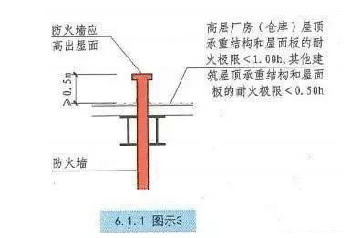 当高层厂房或仓库屋顶承重结构及屋面板的耐火时间小于1.00h,其他建筑屋顶承重结构及屋面板的耐火时间小于0.5h,防火墙须高出屋面0.5米以上。
