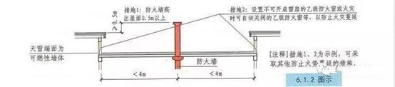 (1)防火墙:其横截面中心水平距离天窗端面小于4米,且天窗端面设计为可燃性墙体材料时,应采取防止火势蔓延的措施。