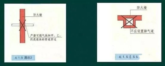 (5)防火墙:墙内不可设置排气道;严禁可燃气体和甲、乙、丙类液体管道穿过防火墙。除开规范规定外的其他管道均不宜穿越防火墙,若确需穿过,应使用防火封堵材料将两者缝隙紧密填实,管道保温材料应使用不燃性材料;如果适应可燃或难燃材料时,须在防火墙两侧的管道上采取防火措施。